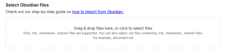 - Drop your .md files from your Obsidian Vault, or click anywhere inside the box to browse and select your .md files. You can also provide a .zip file containing all your Obsidian .md files. Then click “Start processing”.