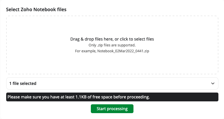 Drop the .zip backup file(s) you exported earlier in the box or click anywhere to open system file picker to select the backup then click start processing.